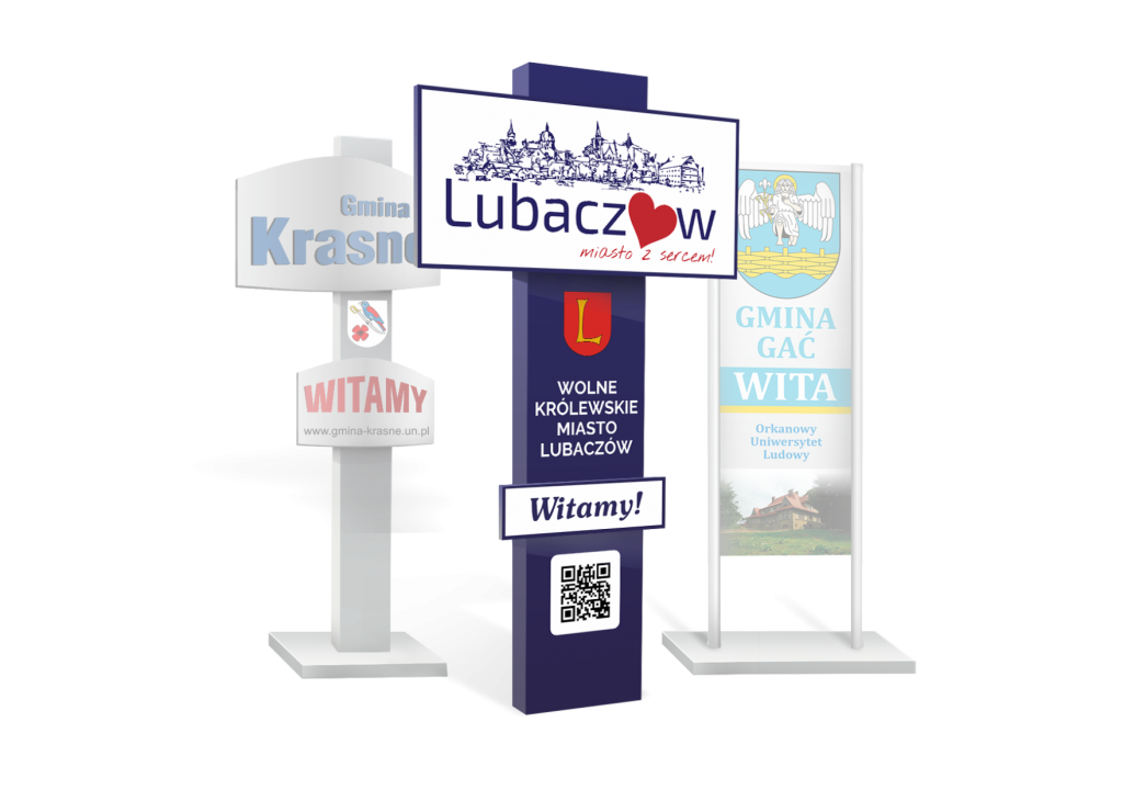Witacze i tablice powitalne odgrywają kluczową rolę w budowaniu pozytywnego wizerunku gminy lub miasta. Poprzez swoją grafikę podkreślają najważniejsze cechy, gałęzie przemysłu i atuty miejscowości, stanowiąc jednocześnie swoistą wizytówkę dla odwiedzających. Zazwyczaj zawierają informacje, takie jak herb miejscowości, kod QR, adres strony internetowej urzędu, a także obraz najważniejszego zabytku lub charakterystyczną grafikę regionu. To nie tylko powitalny gest, lecz także świadectwo dumy z lokalnej tożsamości, które dodatkowo wzbogaca doświadczenie odwiedzających. Cynkowana konstrukcja i nogi zapewniają trwałą odporność na zmienne warunki atmosferyczne, dzięki czemu tablica pozostaje efektownym elementem krajobrazu. Idealna harmonia funkcjonalności, estetyki i trwałości, witająca odwiedzających w sposób wyjątkowy.